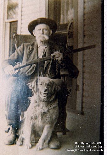 More About BENJAMIN F. BYERS: Shown above with his prized possession his civil war musket. Athens County 18th Ohio Volunteer Infantry Civil War, same regiment as sister's husband's father John Quinn.
